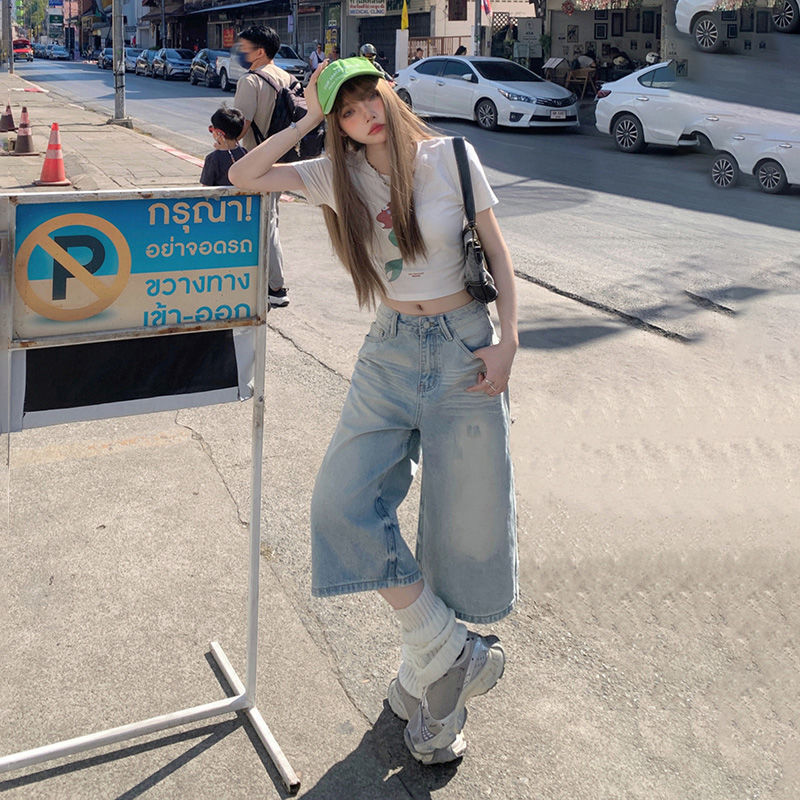 Women's Washed Light-colored Loose Wide-leg Cropped Denim Shorts
